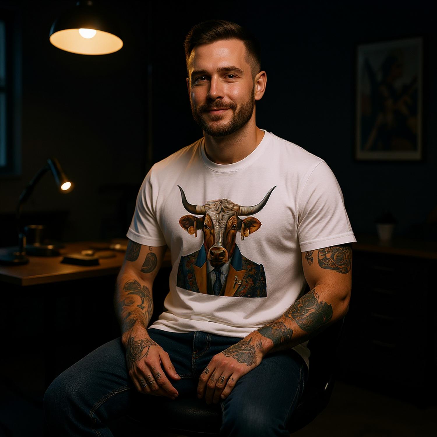 By trade, Eli Voss is a tattoo artist—clean lines, bold contrast, timeless symbolism. But he wanted a shirt that felt like a sharp suit: confident, witty, dandy. He started sketching animals with the manners of gentlemen and gentlewomen, then used AI to explore textures, lighting, and vintage color palettes. The result? A series that blends tattoo clarity with runway poise—tailored animals with unmistakable attitude.